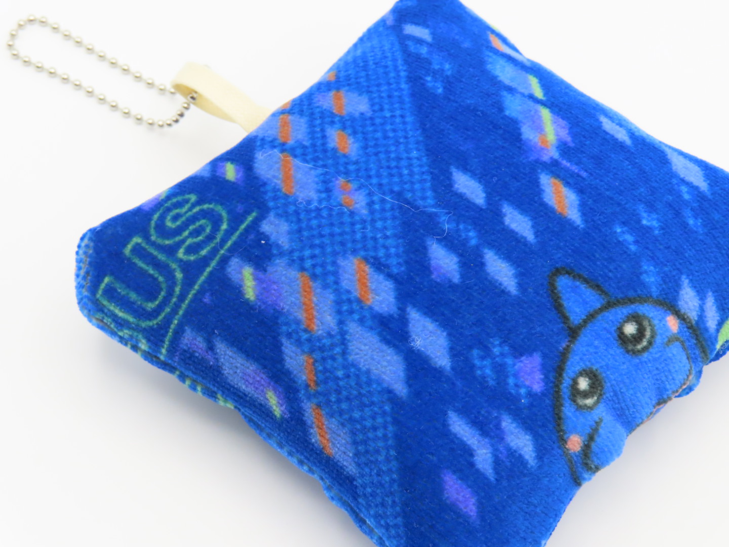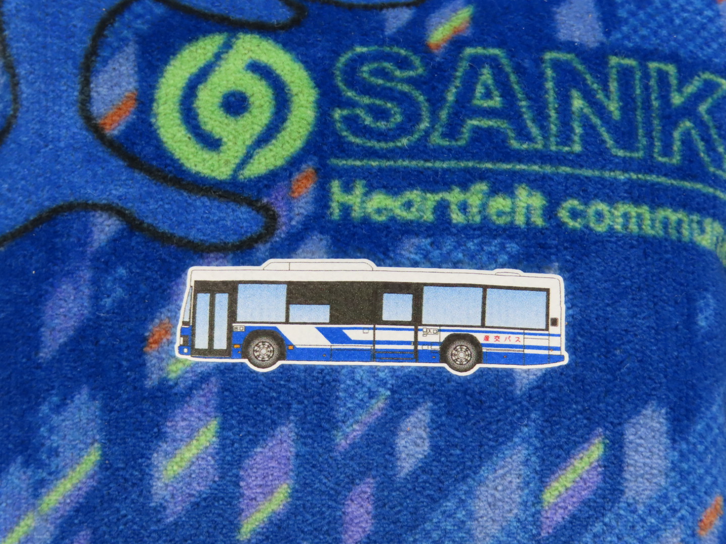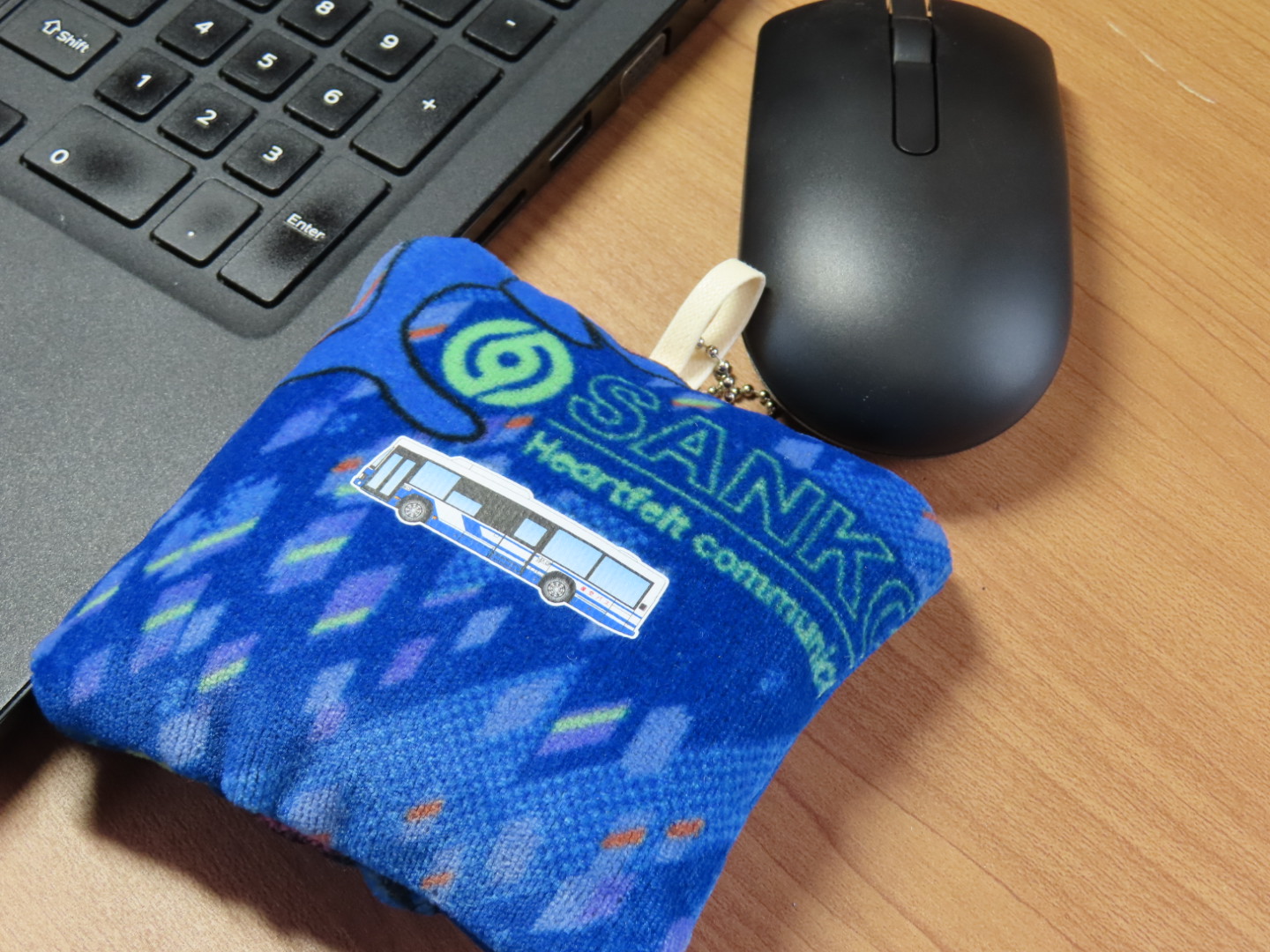 ブルーのイルカ柄生地に「路線バスのイラスト」をプリントしており、バックに下げてもカワイイし、パソコンを使うときにはマウスリストレスト(手首サポートクッション)にもなります。