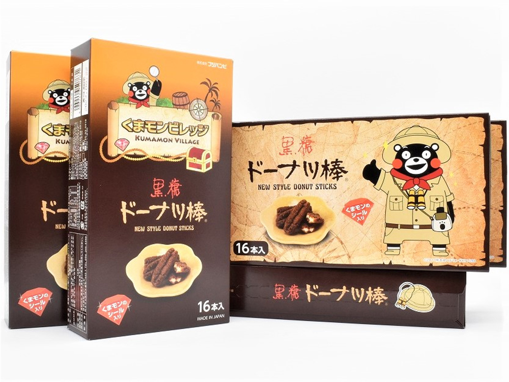 くまモンビレッジと黒糖ドーナツ棒のコラボパッケージです。 くまモンビレッジでの売上はお菓子部門 第1位の商品!