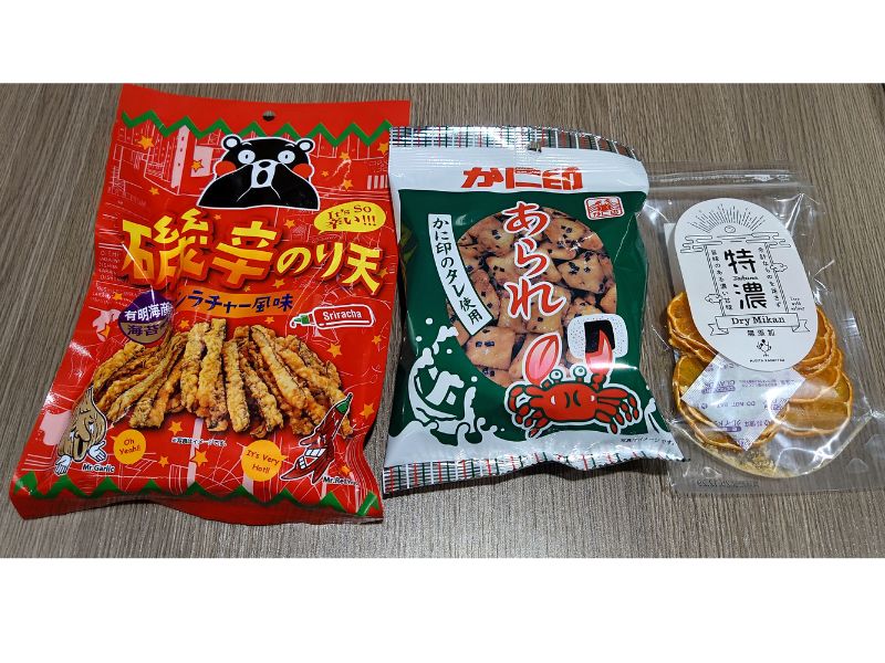 【海苔あられ】もち米(熊本県産)、調味液(砂糖、食塩、発酵調味料、香辛料、たん白加水分解物、昆布エキス、エビエキス(エビを含む)、海苔/調味料(アミノ酸等)、甘味料(スクラロース)