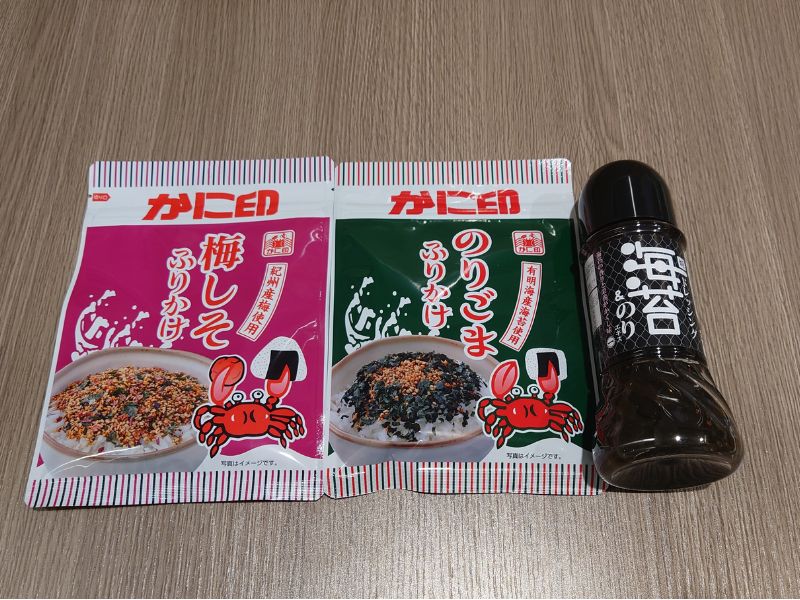 【梅しそふりかけ】原材料名:いりごま(国内製造)、食塩、乾燥赤しそ(赤しそ、食塩、梅酢)、梅フレーク、(梅しそ液)、でん粉、砂糖、のり、しょうゆ、かつお節、たんぱく加水分解物、デキストリン/調味料(アミノ酸等)、酸味料、甘味料(甘草)、着色料(カロテノイド)(一部に小麦・ごま・大豆を含む)