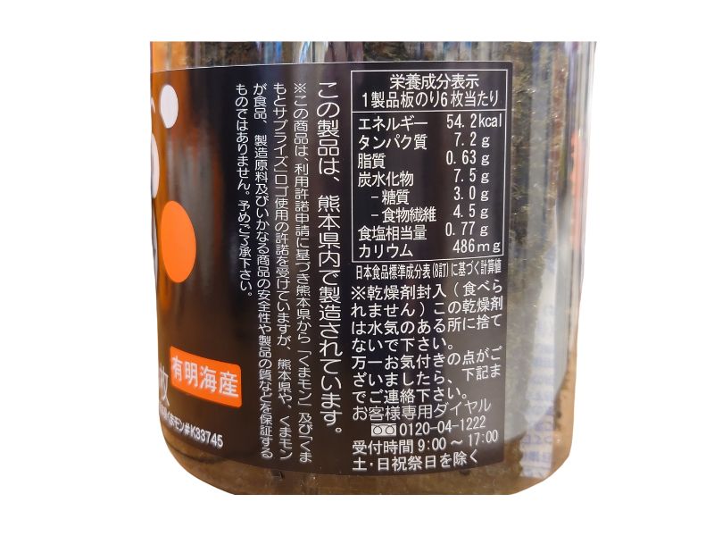 - 原材料名:乾海苔(有明海産)、砂糖、食塩、発酵調味料、香辛料、たん白加水分解物、昆布エキス、エビエキス(エビを含む)/調味料(アミノ酸等)、甘味料(スクラロース)