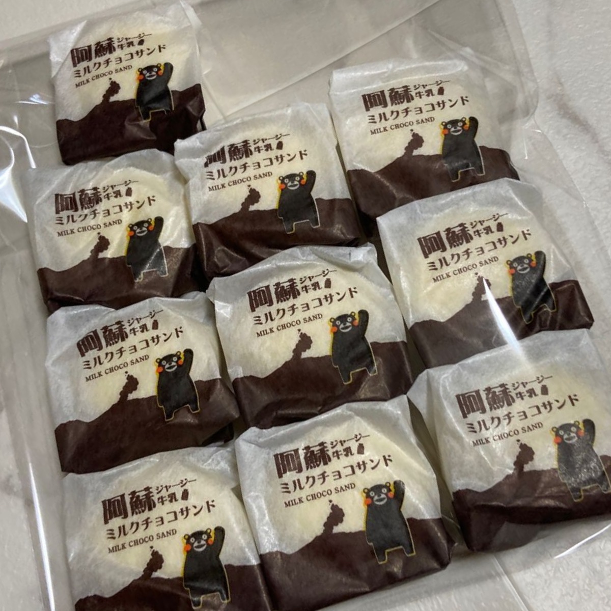 阿蘇ジャージーミルクチョコサンドは、阿蘇小国産のジャージー牛乳を使った、ふわふわのシフォンケーキにチョコクリームをサンドしたお菓子です。