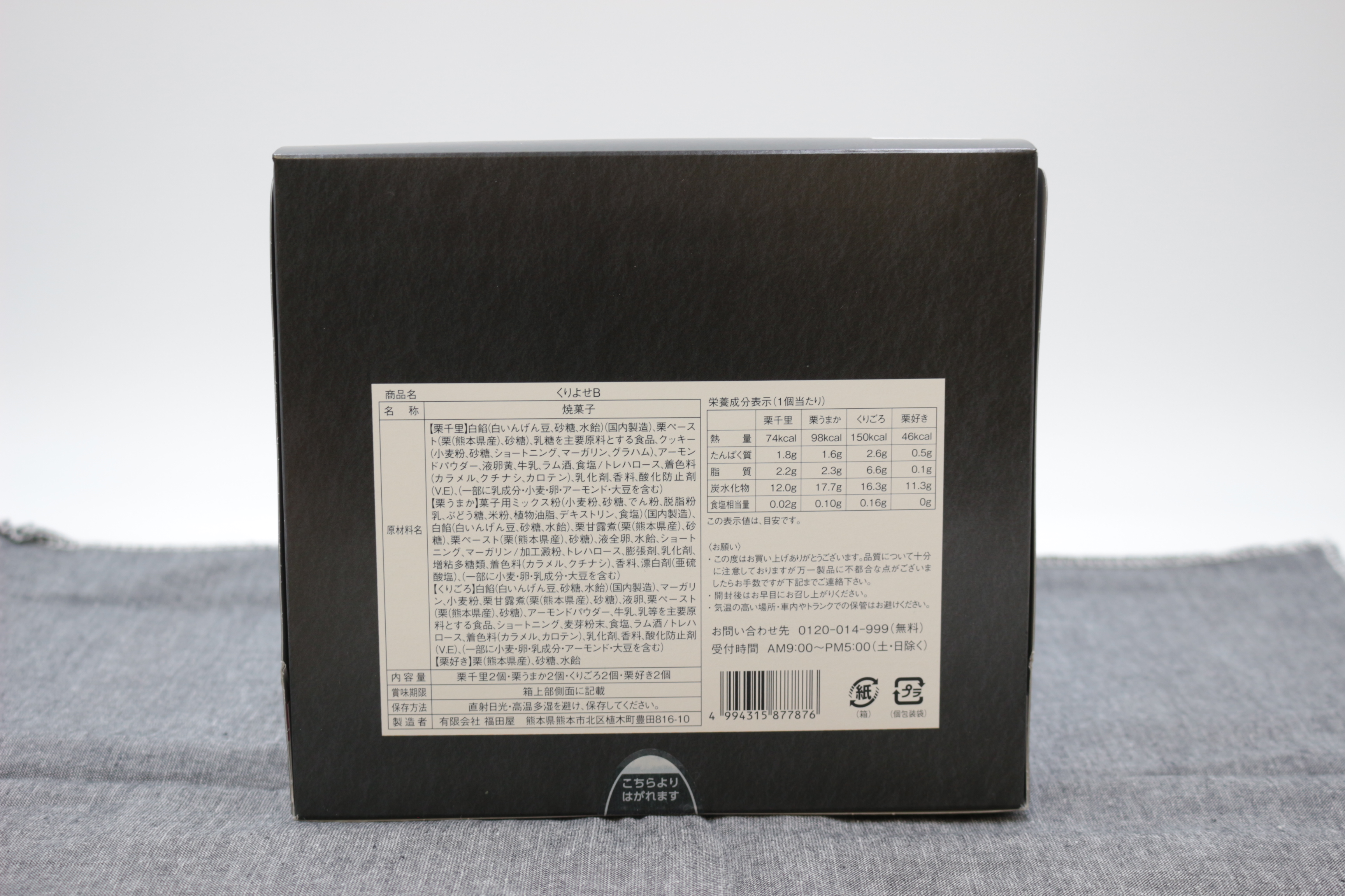- 【栗千里】白餡(白いんげん豆、砂糖、水飴)(国内製造)、栗ペースト(栗(熊本県産)、砂糖)、乳等を主要原料とする食品、クッキー(小麦粉、砂糖、ショートニング、マーガリン、グラハム)、アーモンドパウダー、液卵黄、牛乳、ラム酒、食塩/トレハロース、着色料(カラメル、クチナシ、カロテン)、乳化剤、香料、酸化防止剤(V.E) 【栗うまか】菓子用ミックス粉(小麦粉、砂糖、でん粉、脱脂粉乳、ぶどう糖、米粉、植物油脂、デキストリン、食塩)(国内製造)、白餡(白いんげん豆、砂糖、水飴)、栗甘露煮(栗(熊本県産)、砂糖)、栗ペースト(栗(熊本県産)、砂糖)、液全卵、水飴、ショートニング、マーガリン/加工澱粉、トレハロース、膨張剤、乳化剤、増粘多糖類、着色料(カラメル、クチナシ)、香料、漂白剤(亜硫酸塩) 【くりごろ】白餡(白いんげん豆、砂糖、水飴)(国内製造)、マーガリン、小麦粉、栗甘露煮(栗(熊本県産)、砂糖)、液卵、栗ペースト(栗(熊本県産)、砂糖)、アーモンドパウダー、牛乳、乳等を主要原料とする食品、ショートニング、麦芽粉末、食塩、ラム酒/トレハロース、着色料(カラメル、カロテン)、乳化剤、香料、酸化防止剤(V.E) 【栗好き】栗(熊本県産)、砂糖、水飴