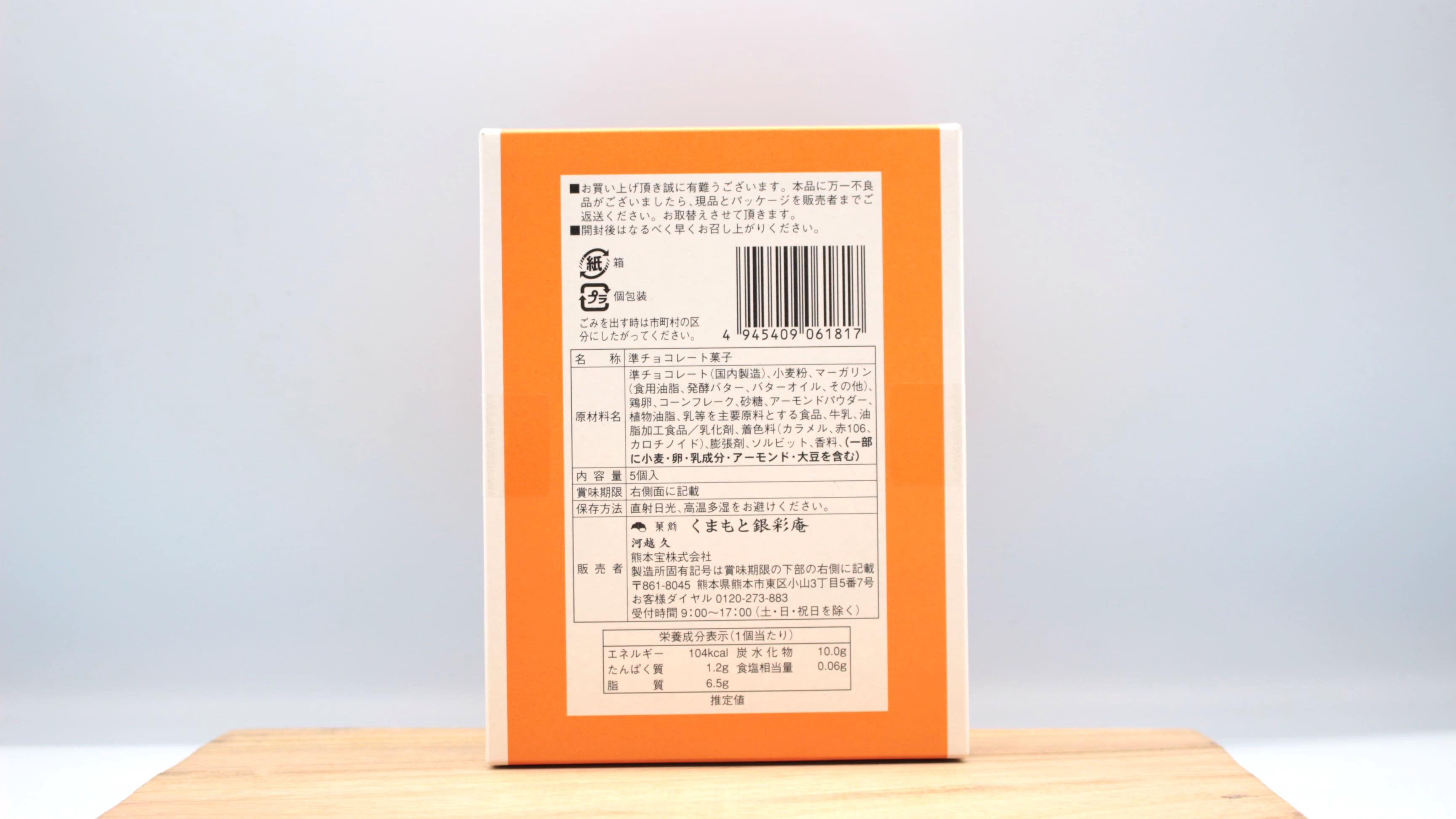 - 準チョコレート(国内製造)、小麦粉、マーガリン(食用油脂、発酵バター、バターオイル、その他)、鶏卵、コーンフレーク、砂糖、アーモンドパウダー、植物油脂、乳等を主要原料とする食品、牛乳、油脂加工食品/乳化剤、着色料(カラメル、赤106、カロチノイド)、膨張剤、ソルビット、香料