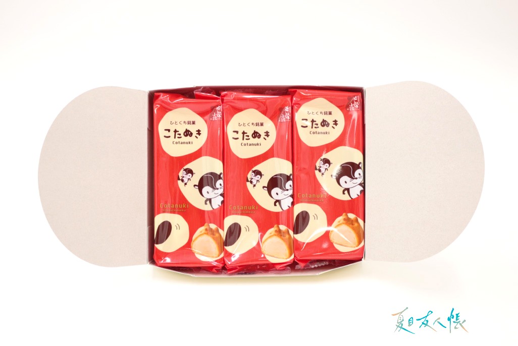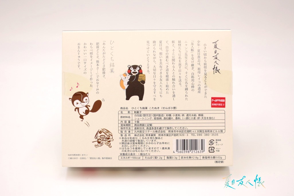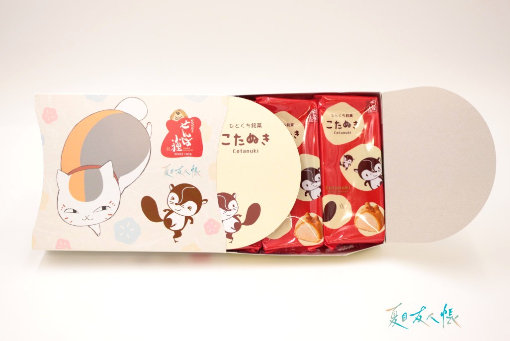 熊本で菓子製造メーカーとして、1950年に創業し、70余年の歴史ある「くまもと菓房」の代表銘菓のひとつである「ひとくち銘菓 こたぬき」。柔らかい生地に職人が炊き上げたあんが程よい甘さと口当たりで舌にとろけます。小狸をイメージしたひと口サイズのかわいいおまんじゅうをどうぞお楽しみください。今回、数量限定にてキャラクターこたぬきと、TVアニメ夏目友人帳のニャンコ先生との夏目友人帳コラボデザインパッケージが登場しました。