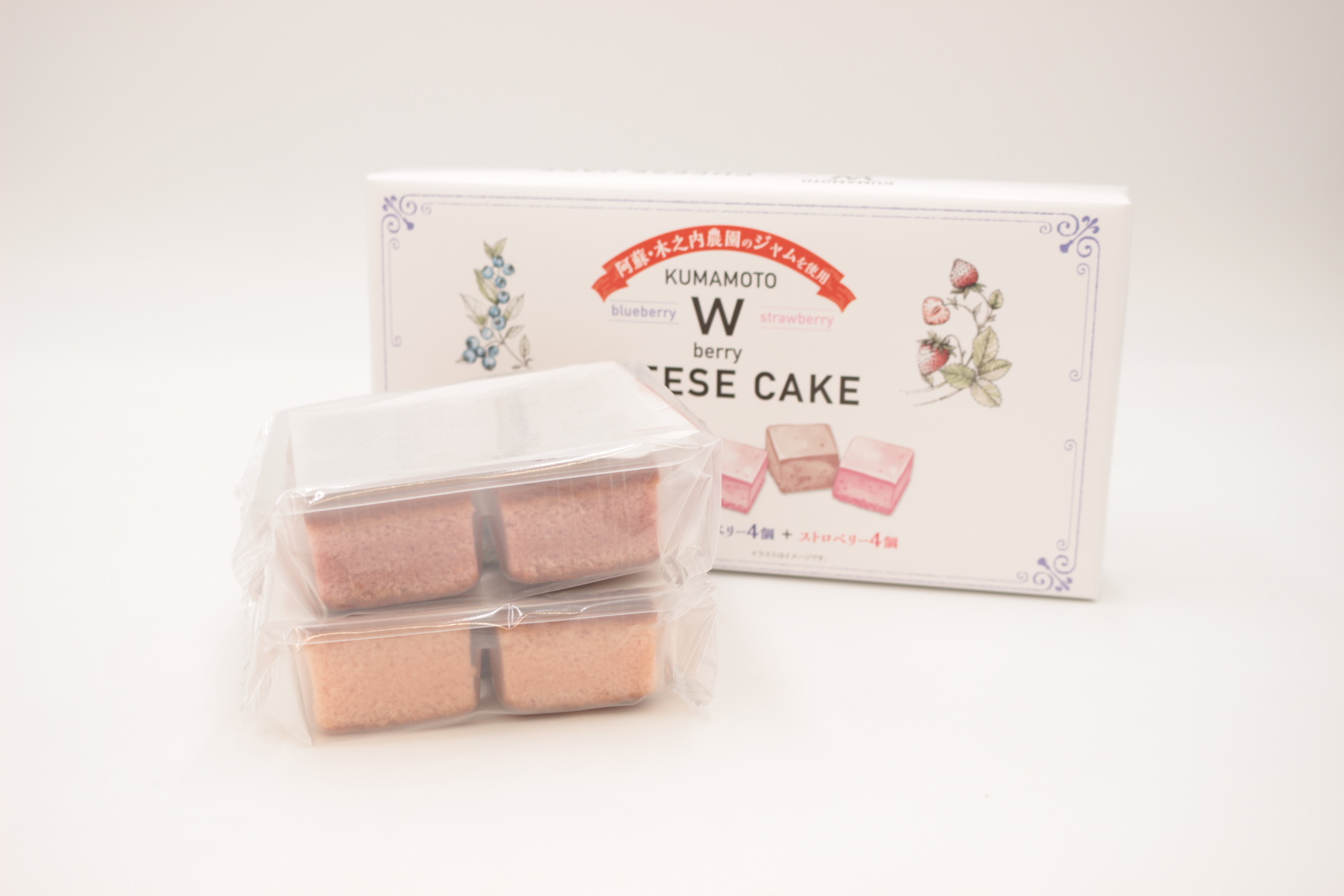 阿蘇山の清らかな水と自然の恵みを活かし大切に育てられた、阿蘇・木之内農園のジャムを使用した、ブルーベリーチーズケーキとストロベリーチーズケーキの2種類が楽しめます。ちょっとしたおやつにいかがでしょうか。
